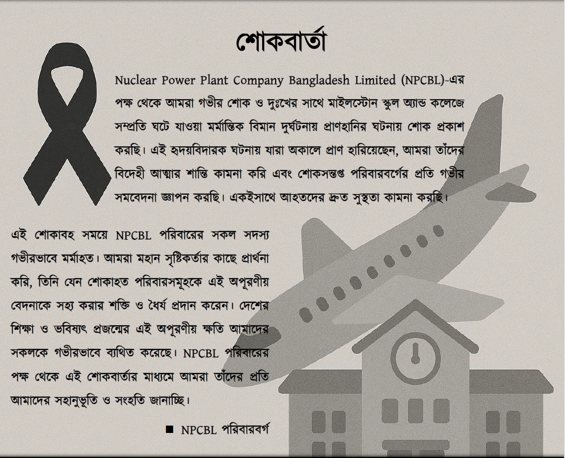মাইলস্টোন স্কুল এন্ড কলেজে সম্প্রতি ঘটে যাওয়া মর্মান্তিক বিমান দুর্ঘটনায় প্রাণহানির ঘটনায় গভীর শোক প্রকাশ